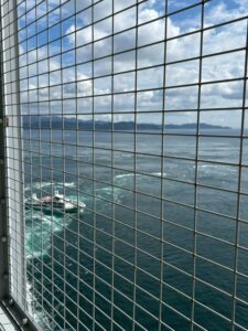 その後鳴門大橋の橋の中を歩いて、橋からうずしおを見に行きましたが、遊覧船からうずしおを見るのとは見る角度が異なり、こちらも絶景でした!